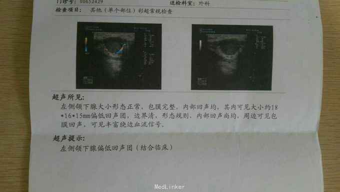 查体:神清,巩膜无黄染,口腔无异常,咽后壁轻度虑泡增生。颌下腺导管口无红肿。左颌下部可及约2*2cm肿块,无红肿,无触痛,肿块活动度小,边界尚清,质偏硬。颈部浅表淋巴结未及。颈静脉无怒张,甲状腺不肿大。气管居中,胸廓无畸形。两肺听诊呼吸音清,未闻及干湿啰音。心脏听诊,律齐,未闻及病理性杂音。腹部平软,肝脾未及,全腹未扪及包块。神经系统无异常,四肢活动正常。 辅查:门诊b超示:左颌下腺偏低回声团。