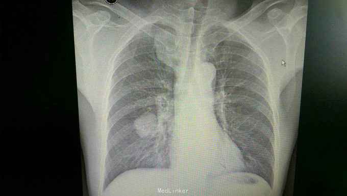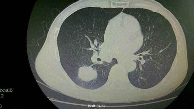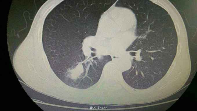 患者入院后,拟行左颌下肿块切除,在术前检查,术前准备时,常规胸片发现右侧肺部肿块,进一步行颈部及胸部ct检查,提示左颌下淋巴结肿大,转移性可能。右下肺周围性肺癌伴右肺门及纵膈多发淋巴转移考虑。决定先行左颌下肿块切除,明确诊断。术后病理示:左(左颌下腺)淋巴结转移性癌,来源首先考虑为肺。患者及家属考虑为晚期肿瘤,拒绝进一步手术治疗及化疗,下颌部切口愈合拆线后,出院。
