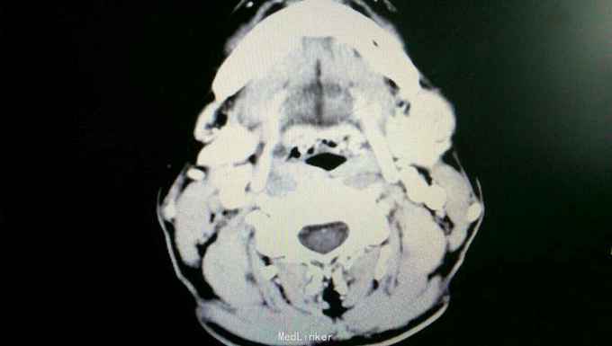左颌下无痛性肿块20天 患者,男性,52岁,已婚。 患者于20天前无明显诱因下发现左颌下约小核桃大小肿块,无明显红肿,无疼痛等不适。无口角歪斜。无发热畏寒,无咳嗽无胸痛,无明显胸闷气急,无消瘦及体重减轻。肿块无明显增大。拟为"左颌下肿块,混合瘤?"收住入院。 患者有烟酒史30余年,烟60支/天。否认结核病史,否认外伤史,否认各系统疾患及传染病史。