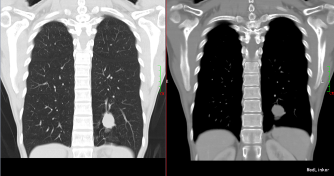 患者女性,33岁因体检发现左下肺肿物8天入院,患者无不适,既往史无特殊。