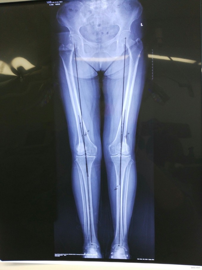 查体:步入病房,步态基本正常,双侧膝关节外翻畸形,无屈曲畸形,四肢肌容量肌张力正常。 辅助检查:见图