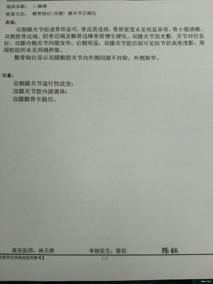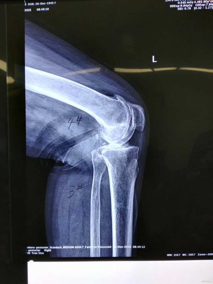患者老年女性,68岁 主诉:双膝关节疼痛30年,加重2年 现病史:患者30年前无明显诱因间断出现双膝关节疼痛,为针扎样痛,无明显放射,休息、制动后可缓解,天气寒冷时疼痛有所加重,不伴弹响、僵直,不伴发热、盗汗。未规律诊治。2年前双膝疼痛再次加重,保守治疗无效。 既往史:诊断高血压病5年,最高150/90mmHg,规律服药,血压控制可。
