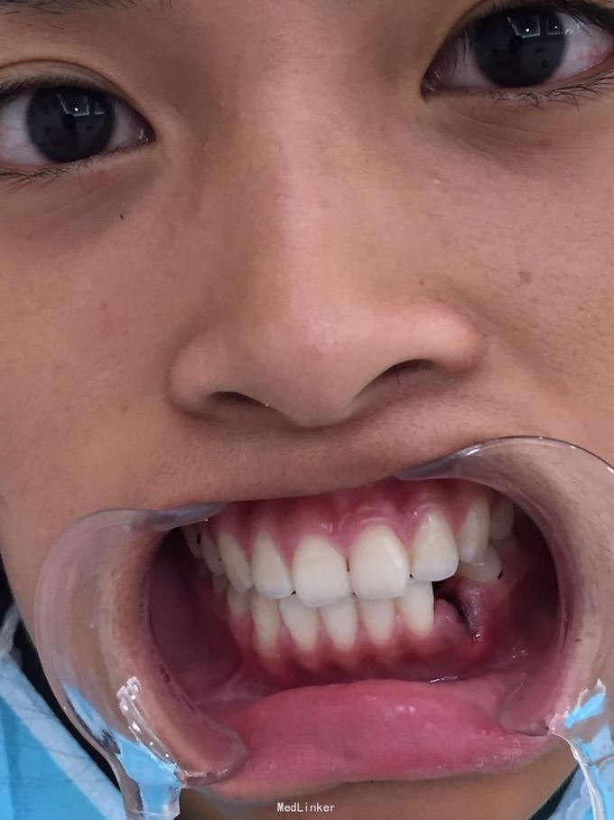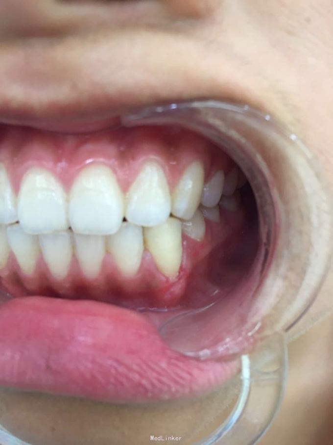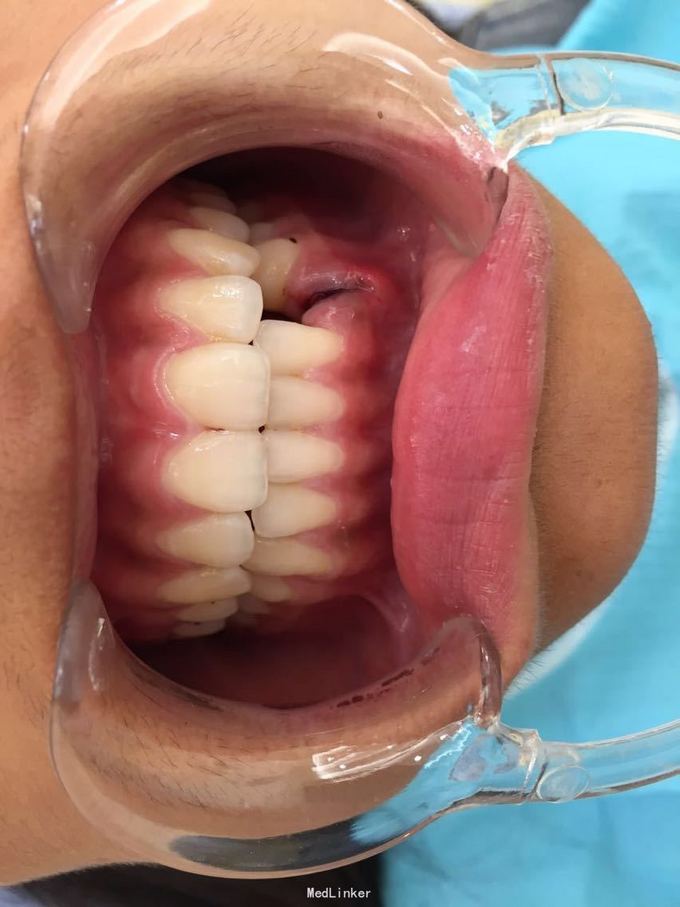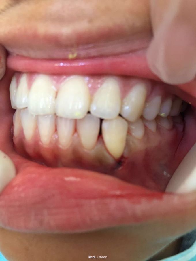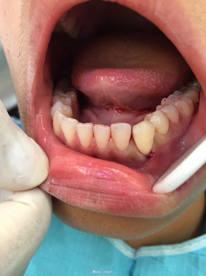 D3牙脱位 D3体外根管治疗后垫底充填,盐水和双氧水浸泡后,刮尽牙根的牙周膜后放置盐水和庆大霉素液中15分钟。局麻下刮除牙槽窝内血凝块至流鲜血后盐水和庆大霉素交替冲洗,明胶海绵拭干牙槽窝,浸泡好的牙体植入牙槽窝内并复位,舌侧树脂牙周夹板固定D123456,牙周上派丽奥。随诊