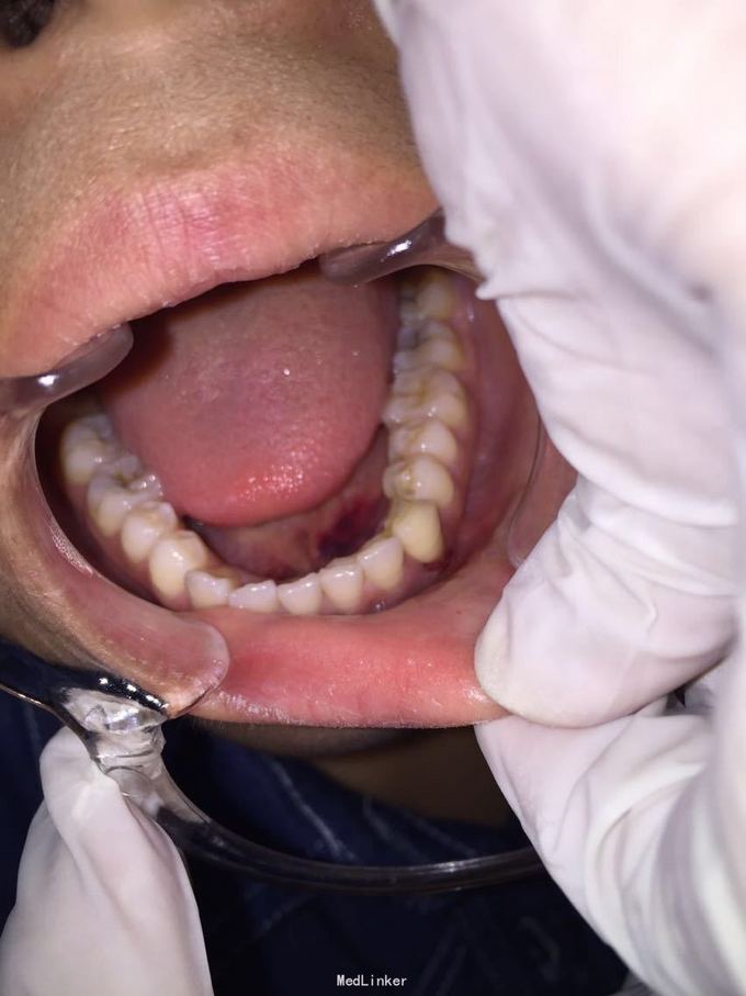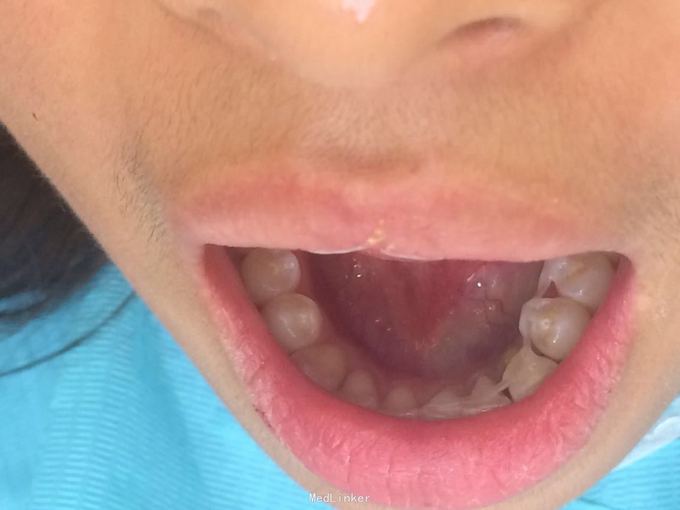 D3完全脱位,伤口血凝块已经凝固,颊侧牙龈钝性撕裂。D2D4无叩痛和松动。脱落牙齿牙体硬组织完好,牙周膜干裂,牙体上有纸屑和食物残渣,根尖有牙髓组织呈黑红色。