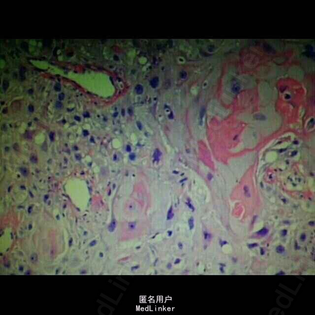 查体:会阴后联合偏右侧可见大小约4*3cm肿物,表面溃烂,少量渗血,触痛明显。阴道畅。可见少量白色分泌物,宫颈萎缩,呈老年性改变,无举痛,无接触性出血,宫体前位,萎缩,表面规则,活动度可,无压痛,双附件无明显异常。 外阴肿物活检病理(图1.图2):外阴高分化磷状细胞癌。MRI:外阴右后缘及皮下不规则异常信号伴强化,右腹股沟淋巴结肿大。SCC:0.4ug/L。