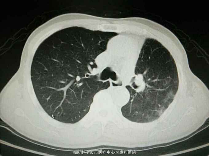 查体:神志清,精神好,生命体征平稳。两肺呼吸音清,未闻及干湿啰音。 辅查:血常规:WBC 9.0×10^9/L,NE 65.1%, Hb 152g/L, plt 246×10^9/L。血CEA 41.6ug/L。小便常规,大便常规,凝血功能,D-二聚体,肝肾功能,电解质均无明显异常。心电图,腹部B超无异常。 2015-10-30我院胸部CT见下图。