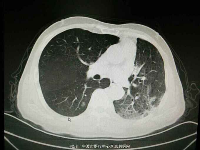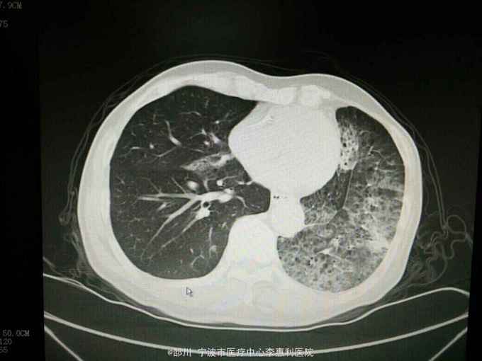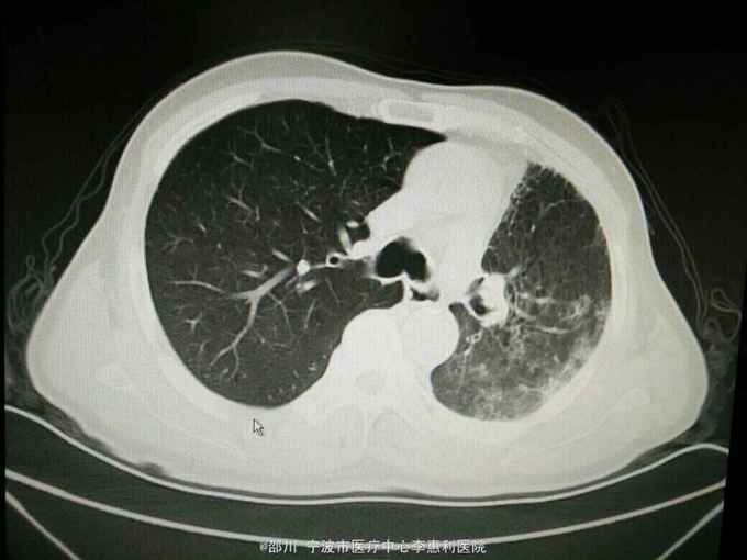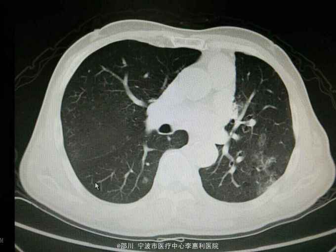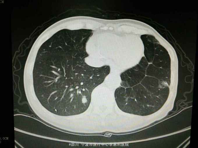 患者男,69岁。左上肺腺癌术后3年余,因“咳嗽咳痰半月余”入院。 病史: 3年余前无明显诱因出现咳嗽,少量白痰,无咯血,无胸痛,至上海某医院就诊,诊断为“左肺阴影:肺癌?”,于2012-5-17全麻下行“左肺上叶切除术”,术后病理提示“肺腺癌”,随后予2012-6-26和2012-8-2在宁波某医院行化疗2个周期(培美曲塞针0.8d1, 卡铂针0.4d1) , 以后定期复查胸部CT和血肿瘤标志物,未发现明显肿瘤复发征象。2015-4-23患者在我院查胸部CT提示“左肺多发炎症样高密度影,右肺多发结节”。半月余前患者出现咳嗽,有少量白痰,无发热,无胸闷气促,2015-10-30我院复查胸部CT提示“左肺弥漫性高密度影,右肺散在多发结节,较4-23片范围,大小均增大”。 既往有“高血压病”史3年,平时规律服用药物治疗,血压控制良好。否认其他疾病史。 个人史,婚育史,家族史无殊。 2015-4-23我院胸部CT见下图。
