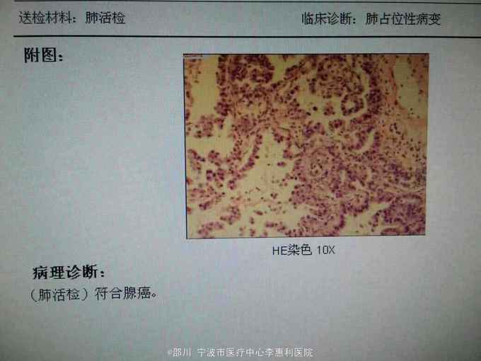 入院后予止咳等对症支持治疗,考虑到患者无发热,黄痰等感染症状,血炎症指标如CRP等无升高,胸部影像提示对比前片,肺部阴影逐渐增多,因此拟诊“肺癌术后复发”,为明确诊断,予CT引导下行经皮肺穿刺,病理提示“腺癌”,同时待EGFR基因突变检测回报,根据检测结果决定下一步治疗方案。病理报告见下图。