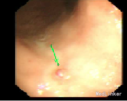 本例患者胃镜仅见胃壁粘膜局部充血肿胀表现,未见明显溃疡及结节灶。术后病检提示“胃癌”。本例患者以上消化道出血为主要临床表现,无肝硬化病史,胃镜见胃体小弯侧动脉残端并出血,术前诊断Dieulafoy病,术后大片组织病理诊断胃癌,究竟胃癌和Dieulafoy病是单纯合并出现或是在胃癌的基础上诱发Dieulafoy病, 有待于进一步研究。