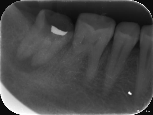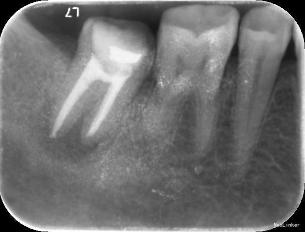 检查:右下7髓腔开放,可见髓腔内食物残渣及部分银汞充填体,叩痛(++), 冷热刺激无反应,松动1度,牙体已制备,牙合龈距离低,X线片示根尖区密度减低区。