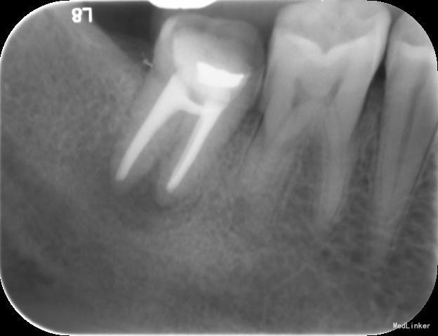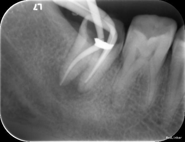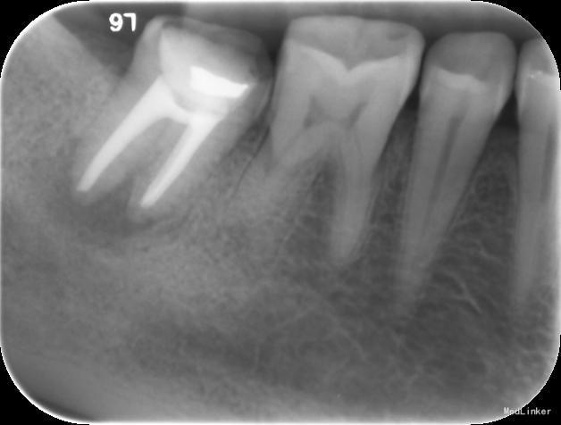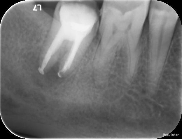 主诉:右下颌第二磨牙髓腔开放1月余 现病史:1月前因牙齿疼痛于院外口腔诊所行右下后牙髓腔开放术及根管治疗术,未行继续治疗,今来我科行右下后牙牙体治疗。 既往史:6年前行右下后牙牙体治疗术及冠修复术,术后疼痛未消失,2年前再次行根管治疗术,术后效果不理想,偶发疼痛,自诉根尖区阴影持续存在。