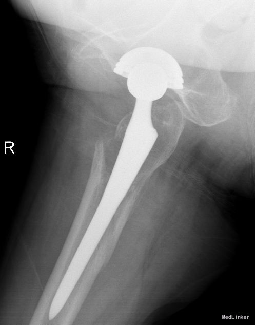 主 诉:摔倒致右髋关节疼痛伴活动受限3小时余。现病史:3小时前因摔倒致右髋关节疼痛伴伸屈活动受限,不能站立、行走。急诊120送至我院就诊。急诊经检查后以“右侧人工全髋关节置换术后假体周围”为诊断转入我科。患者7年前因“右股骨颈骨折”曾于我院行右侧全髋关节置换术。发病以来,神志清楚,精神尚可,无恶寒发热,饮食、大小便正常,睡眠可,体重无明显变化。