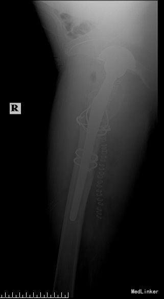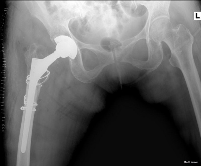 望:神志清,精神尚可,面色红润,营养良好,体型中等,舌红,苔薄黄;闻:语声清晰,呼吸均匀,未闻及特殊气味;切:脉弦紧。平车推入病房。右下肢较对侧未见明显短缩,外旋畸形,肌肉未见明显萎缩,右腹股沟饱满,腹股沟及大转子处压痛明显,右髋关节活动不能,“4”字实验因患者疼痛拒查,右下肢纵向叩击痛阳性,双下肢肌力未见明显异常。双下肢皮肤感觉未见明显异常,末梢血液循环尚可。X线检查:右侧人工全髋关节置换术后假体周围骨折。