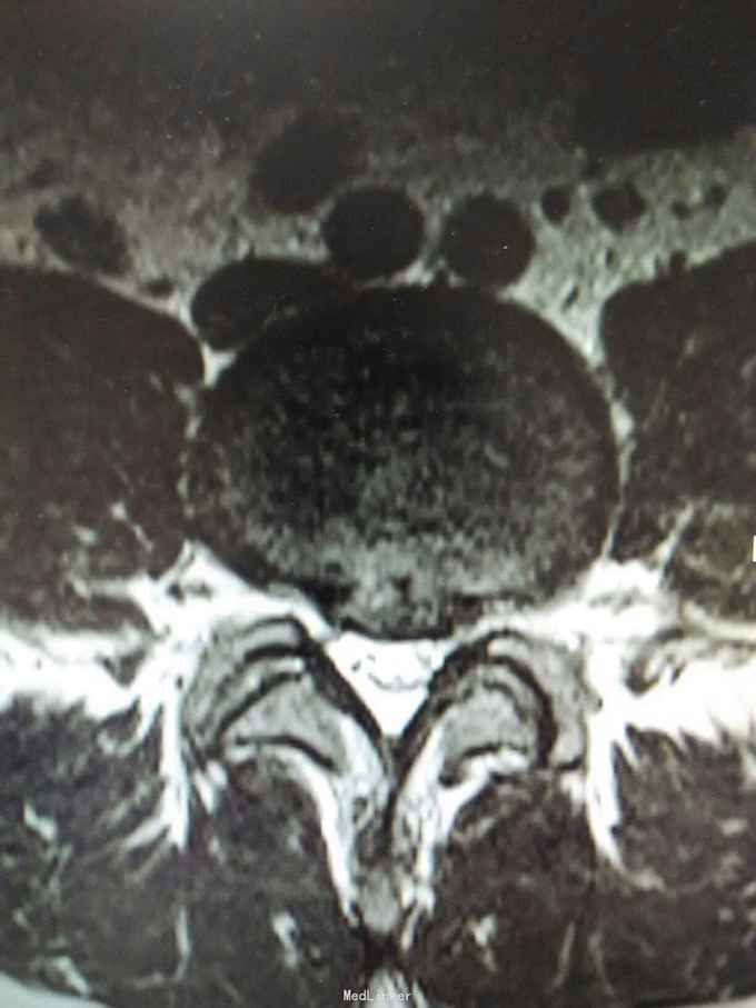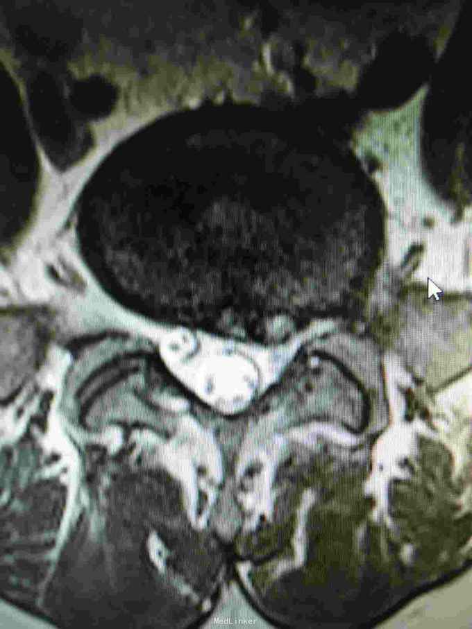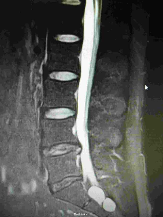 29岁男性,腰腿疼5个月,加重1周,近一周疼痛向右臀及大腿放射至足底伴麻木。