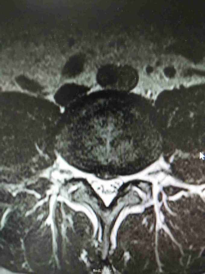该患者L4/5椎间盘中央突出,L5/S1椎间盘向左突出。手术右侧L4/5,L5/S1开窗,见骶1神经根与骶管囊肿粘连,压迫变性,水肿,变粗硬化。