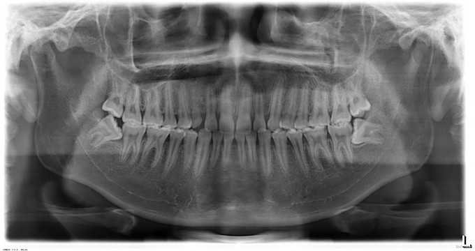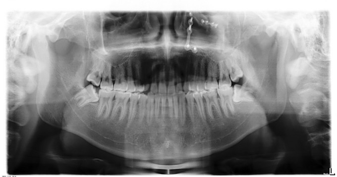双侧颜面稍不对称。左眼周可见疤痕,眼裂较右眼变窄。左眼视物不见,瞳孔对光反射(-)。双侧颞下颌关节髁突动度对称,无活动受限,无弹响、无疼痛。开口度、开口型正常,咬合关系正常。