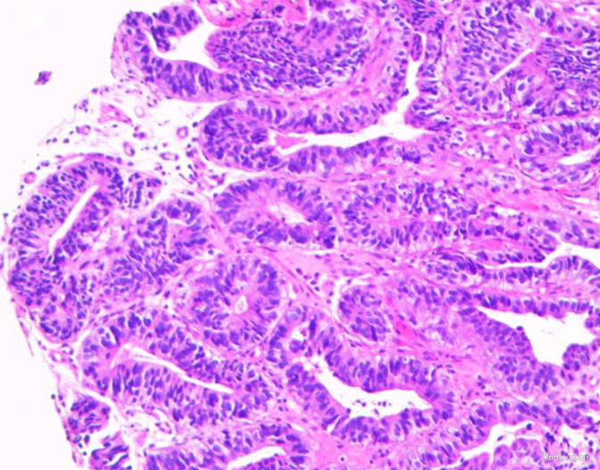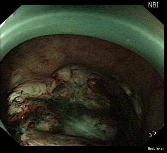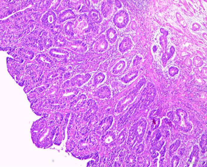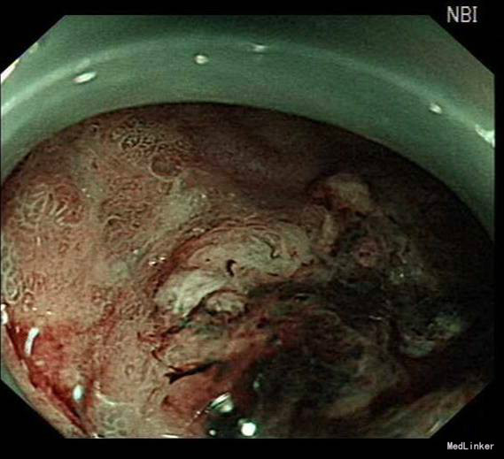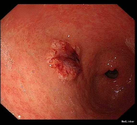 患者,男性,69岁,间歇性中上腹隐痛1月,加剧1周来我院门诊就诊,胃镜检查:见胃窦前壁处可见一1.5*2.0cm粘膜隆起,表面粗糙,见图1,胃镜诊断:胃窦粘膜隆起(性质待病理),慢性浅表性胃窦炎伴胆汁反流,10月26日门诊病理:胃窦:慢性萎缩性胃炎,急性活动,伴部分腺体中重度不典型增生,局灶重度不典型增生。于2015年10月28日入院。