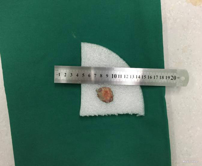 随访:出院后2周,电话随访患者,一般情况良好,无不适主诉。 讨论:该患者胃镜见一胃窦前壁粘膜隆起,表面粘膜粗糙,病理示:慢性萎缩性胃炎,伴部分腺体中重度不典型增生,局灶重度不典型增生,超声胃镜病灶未突破粘膜下层,有胃ESD手术指征,故行全麻下胃ESD术。术后病理:胃窦前壁肿瘤:腺上皮高级别上皮同瘤,部分癌变,病变大小1.5*1.1*0.3cm,基底及切缘未见癌。说明手术成功,切缘及基底均无肿瘤侵及。对于早癌患者我们完全可以通过采用ESD方法治愈患者,胃镜下切除早癌较腹腔镜创伤更小。我和患者解释时是这样说的:腹腔镜是微创,而我们内镜下ESD则是微微创。