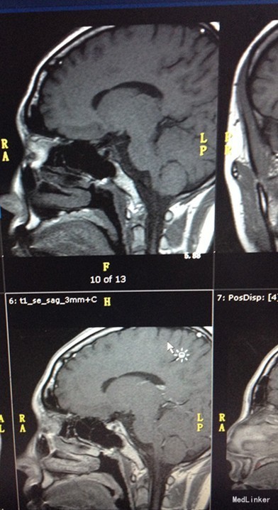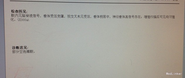 入院查体:无明显异常。 辅助检查:血清泌乳素测定PRL184.00mIU/L。 促性腺激素系列:血清促卵泡刺激素测定FSH0.83mIU/mL,血清促黄体生成素测定LH1.22mIU/mL。 男性激素系列:血清睾酮测定TES2.86nmol/L,血清游离睾酮F-TEST11.79pmol/L,性激素结合球蛋白SHBG72.80nmol/L,血清雄烯二酮测定AND5.53nmol/L,血清脱氢表雄酮及硫酸酯测定DHS6.00umol/L。 雌性激素系列:血清孕酮测定PRG0.77nmol/L,血清雌三醇测定UE3<0.24nmol/L,血清雌二醇测定E2<73.40pmol/L。 妇科超声:子宫附件区未见明显异常回声。垂体增强MR:部分空泡蝶鞍。腰椎骨密度:估量减少。 5日法戈那瑞林兴奋试验: 0分 30分 60分 120分 LH(mIU/mL) 0.11 4.46 4.70 4.41 FSH(mIU/mL) 1.47 3.50 3.93 4.90