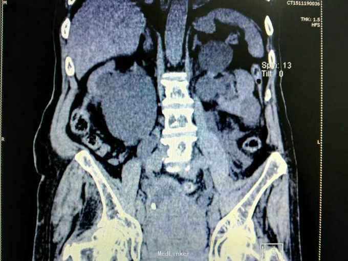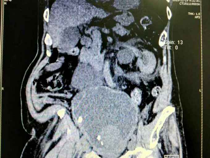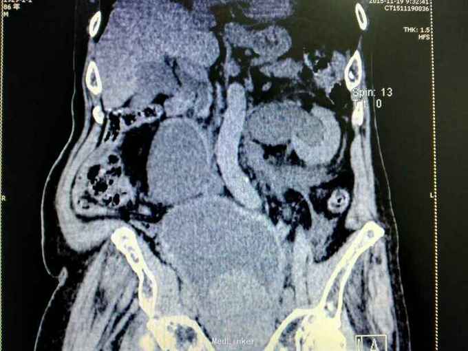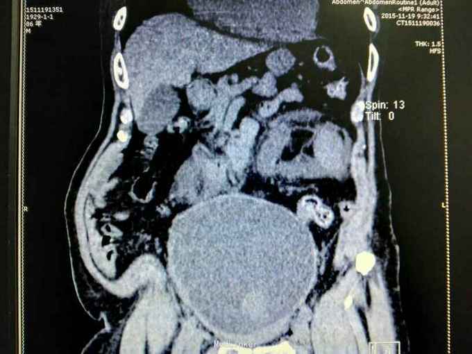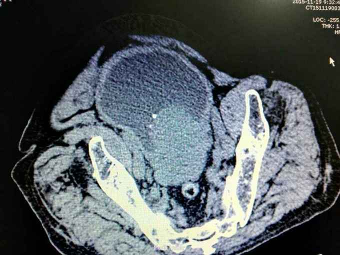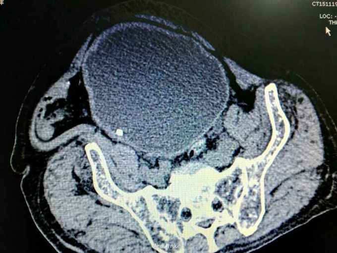 腹部明显膨隆。耻骨上膀胱区扣浊。肾区无扣痛。尿常规少许白细胞。肌酐506,电解质正常。Hb116。