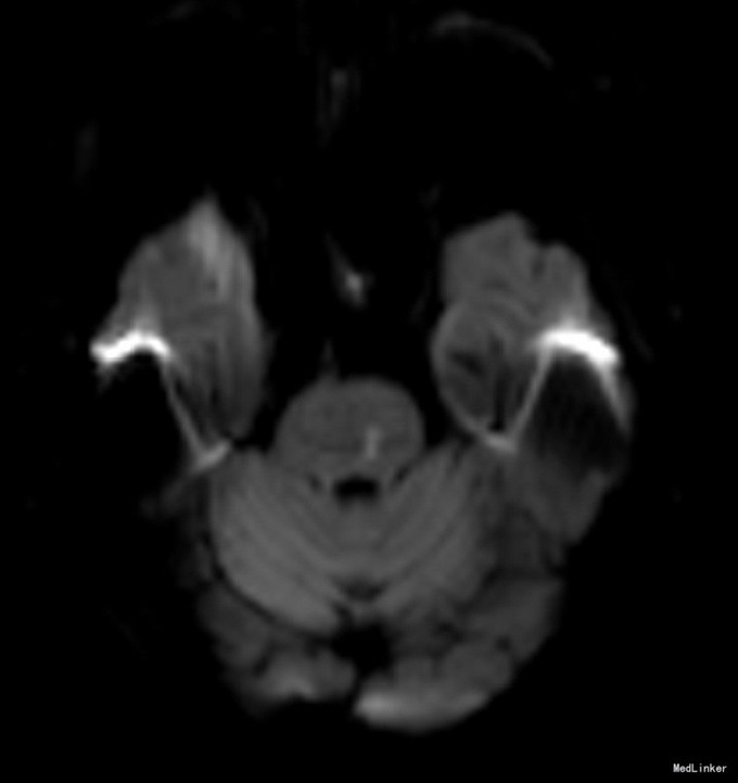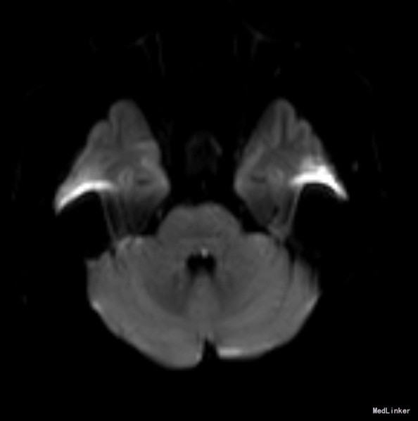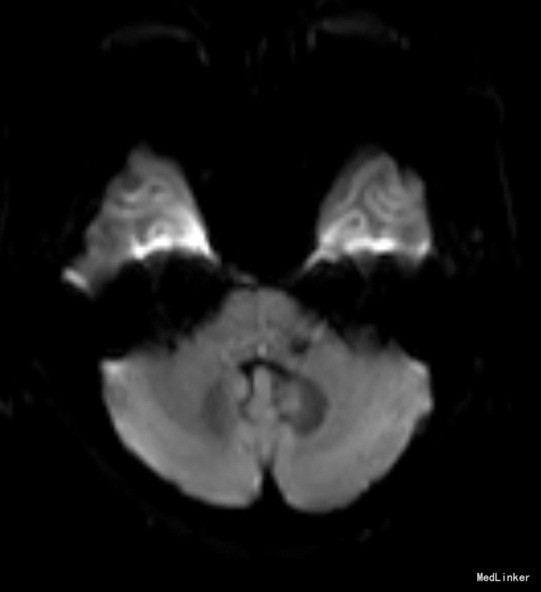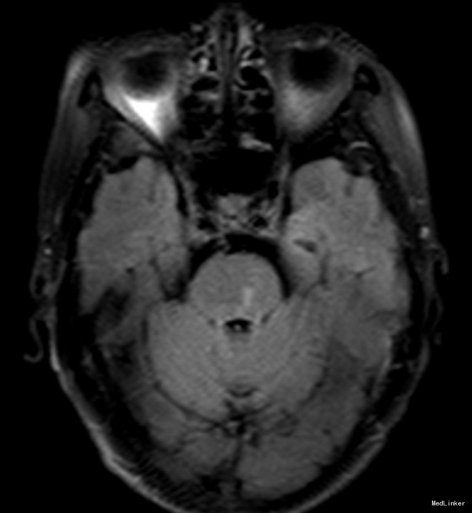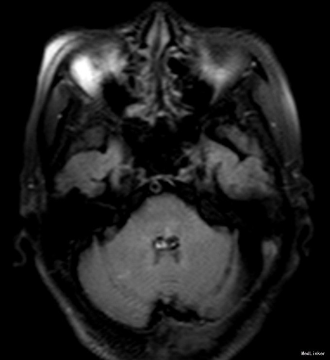 老年女性,急性起病。查体可见左眼内收受限,双眼右视时有水平眼震。影像学提示左侧桥脑背侧梗塞。与临床相符。考虑前核间性眼肌麻痹。 附上另一例前核间性眼肌麻痹头MRI,如图: