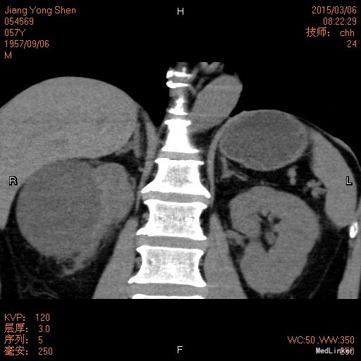 1、患者,男,57岁,因发现右肾囊肿3年。收住入院。 患者3年前自觉腰部不适,当地区医院行泌尿系彩超检查发现右肾囊肿,大小约2cm,未予注意,3月后因血压控制不良住院期间复查发现囊肿增大至4-5cm,考虑当时血压控制不佳,未予手术治疗,17天前因血压控制不佳来我院内分泌住院治疗,期间复查双肾CT发现囊肿增大至8cm,且周围伴小囊肿,考虑当时血压控制不佳,未予治疗,现患者血压、血糖控制可,遂来我院门诊就诊。