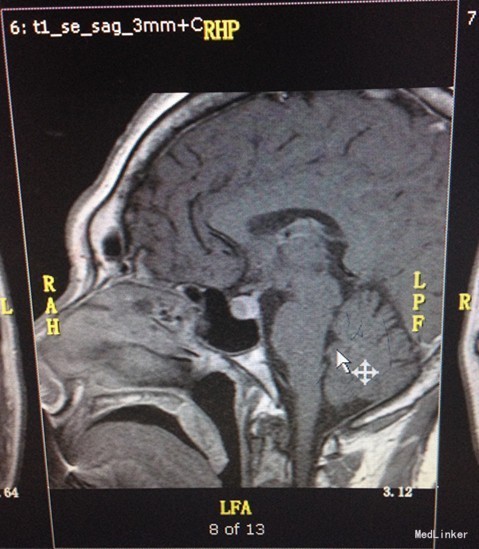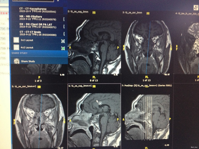 入院查体:口唇增厚,牙列增宽,牙齿稀疏,全身皮肤粗糙、粘膜无黄染及出血点,颈软,左侧甲状腺已切除,可见长约5cm的手术瘢痕,右侧无肿大。 辅助检查, 2015-09-22 08:08 oGTT+胰岛功能: 0分 30分 60分 120分 180分 血糖(mmol/L) 5.67 9.34 11.51 8.16 6.51 胰岛素(mIU/L) 20.77 55.12 148.90 35.43 65.24 C肽(pmmol/L) 1038.472 1957.37 3635.73 3194.84 2571.01 2015-09-22 08:08 葡萄糖抑制试验: 0分 30分 60分 120分 180分 血糖(mmol/L) 5.67 9.34 11.51 8.16 6.51 IGF-1(ng/ml) 1131.00 1196.00 1326.00 1259.00 1002.00 GRH(mIU/L) 32.10 22.80 27.10 23.00 26.00 促性腺激素系列:血清促卵泡刺激素测定FSH35.70mIU/mL,血清促黄体生成素测定LH14.30mIU/mL。血清泌乳素测定PRL257.00mIU/L。尿常规:白细胞每高倍视野JJWBC31.89/HPF,上皮细胞每高倍视野JJEC2.67/HPF,白细胞WBC175.40/uL,上皮细胞 EC14.70/uL。垂体MR平扫+增强:蝶鞍扩大,鞍底下陷,垂体形态饱满,体积增大,垂体右侧T2信号减低,增强后病灶轻度强化,低于正常垂体组织,大小约为1.4x0.8x1.2cm(左右x上下x前后),垂体柄略向左偏移,双侧视交叉略上抬,双侧颈内动脉虹吸部走行正常。诊断意见:鞍区占位性病变,垂体腺瘤可能大,请结合临床。颅脑CT平扫(64排):脑CT未见异常。