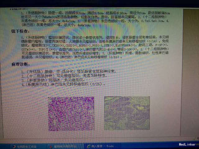 肠镜及活检结果:升结肠中-低分化腺癌。 治疗:腹腔镜右半结肠癌切除术,术后化疗。