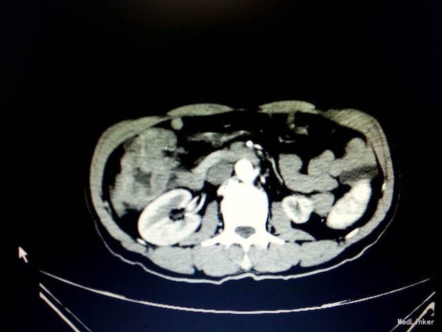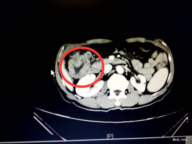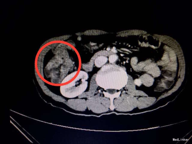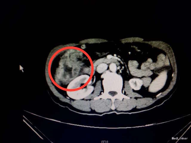 查体:消瘦体型,心肺查体阴性。腹软,右上腹深压痛,无反跳痛,未触及包块,肠鸣音正常。 辅助检查:入院血常规、生化、肝肾功、凝血、传染病未见明显异常。胃肠肿瘤指标正常。大便隐血试验(+)。腹部CT结果:结肠肝曲肠壁局部明显增厚,增强扫描强化明显,考虑恶性肿瘤,累及浆膜层(如下图所示)。