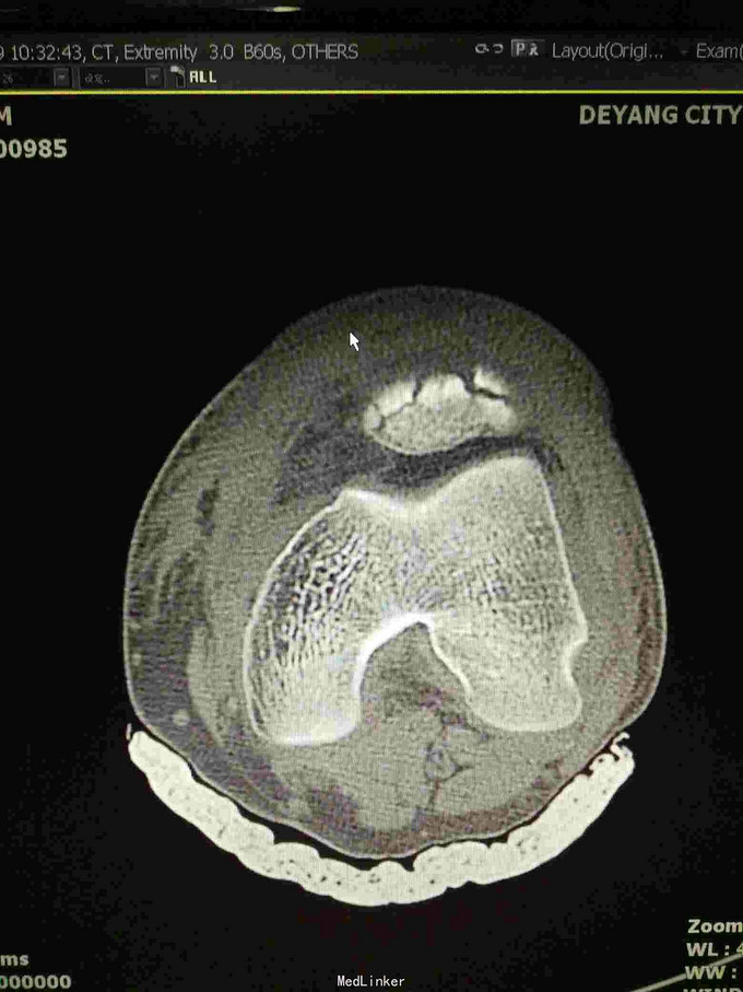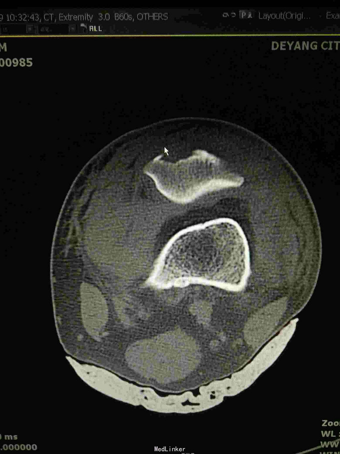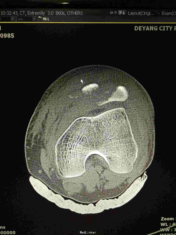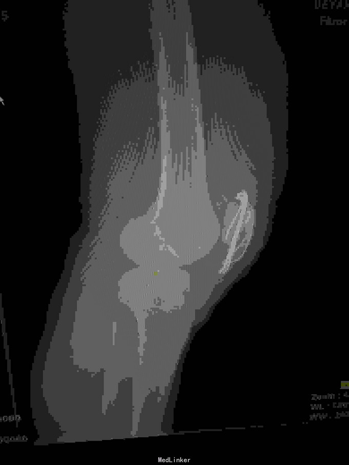 查体:左下肢活动受限,背伸障碍,左膝关节明显肿胀,压痛,扪及骨擦感,左足感觉及血循环可。 x片:左髌骨骨折。