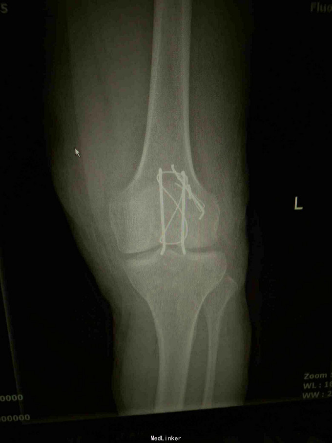 诊断:左髌骨粉碎性骨折; 治疗,石膏固定,消肿止痛,行髌骨骨折切开复位克氏针内固定术,术中克氏针张力带钢丝固定,术后石膏固定。