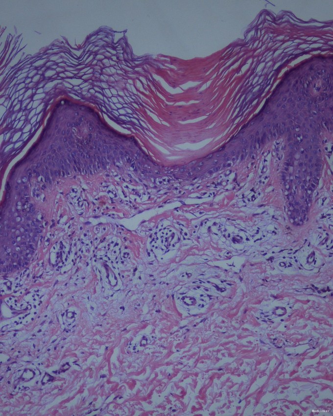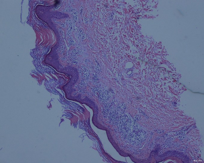 查体:右下肢自臀部自足背外侧,线状分布褐色角化丘疹,融合。 病理:取角化隆起的部位做检查,可见特征性的改变。在角质层内有一楔形的鸡眼样板,它是一个由角化不全细胞所组成的细胞柱,在鸡眼样板下方的颗粒层减少或消失,棘细胞层内有胞浆嗜酸性染、核深染的角化不良细胞。