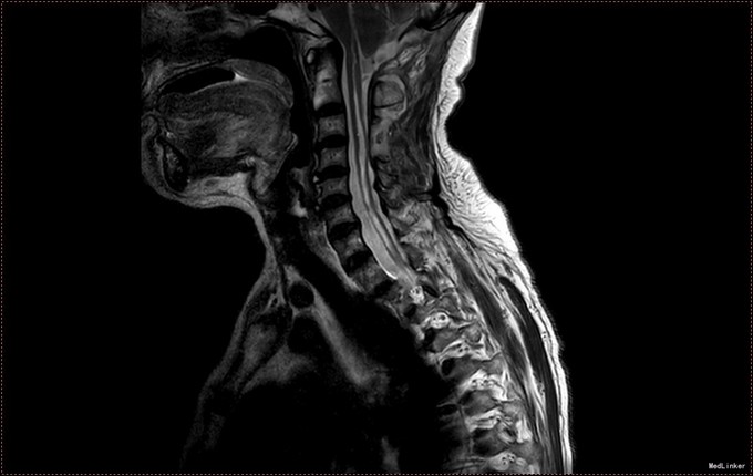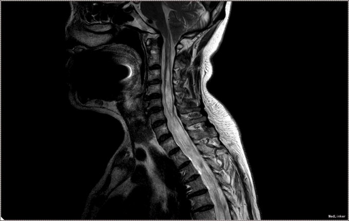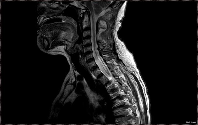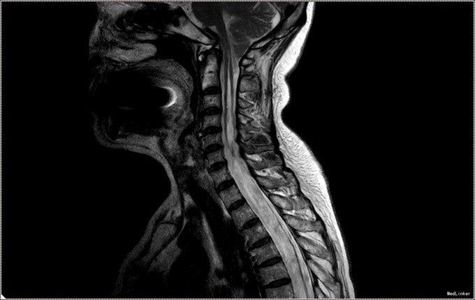 患者,女,58岁,以“四肢麻木无力,走路不稳30余年”为主诉入院。患者于30年前无明显诱因出现左侧肢体麻木,痛温觉减退,逐步发展为四肢及躯干麻木,双手起水疱,四肢肌肉萎缩,双下肢肌力减退,无恶心呕吐,未经系统治疗,于2015年10月12日在我院行颈椎MR示“脊髓空洞症”,今为求进一步诊治来我院,门诊以“脊髓空洞症”为诊断收入院,患者便秘史10余年,排尿不畅4年,睡眠、饮食正常,体重未见明显变化。