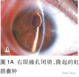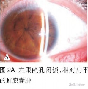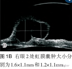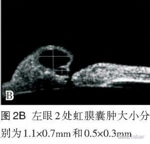 内科检查无异常。 眼科检查:双眼球水平震颤,右眼视力0.1,左眼视力0.12,右眼角膜透明,KP(一),前房常深,周边前房约3/4CT,Tyn(一),瞳孔闭锁,上方见 隆起的虹膜组织,瞳孔呈针尖样改变,晶状体及眼内窥不清(图1A)。左眼角膜透明,前房常深,Tyn(一),瞳孔闭锁,中央0.5 mln透见晶状体前囊膜,眼内窥不清(图2A)。予双眼复方托吡卡胺滴眼液,连续3次点眼,瞳孔状态无变化。 眼部辅助检查:验光测不出,矫正视力不提高。 非接触眼压:右眼14 mmHg,左眼13 mmHg。 双眼B超未见异常。 UBM检查:双眼中央略偏上均有两处虹膜囊肿(图1B,图2B),睫状突到晶状体赤道部的距离各方向不等。 双眼VEP因眼球震颤,无法检查。
