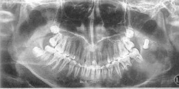 体检: 领面不对称左下领骨隆起, 左下6、7、8 牙前庭均突出, 但无松动。X 线检查: 左下领骨见有7.o x 8.s c m 圆形分隔透光区, 边缘呈分叶状改变。其中可见间隔线及致密硬化带, 牙根尖部有骨质吸收. 诊断: 左下领骨造釉细胞瘤
