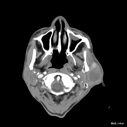 主诉:左侧腮腺区肿物渐大6年 病史:患者老年男性,慢性病程;患者6年前发现左侧腮腺区肿物,无伴其他症状,期间曾自行用药酒外敷,具体不详,肿物渐行增大,伴有疼痛,遂前来我科求治。