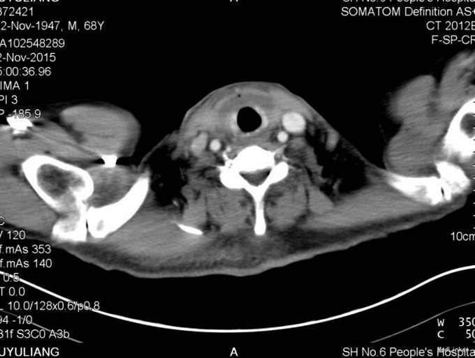 患者男,67岁。发现甲状腺结节4年余,近1个月增大明显,无声音嘶哑,无吞咽困难。