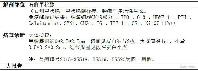 术后病理:2015-11-9 病理检查报告:右中央区淋巴结 (右中央区淋巴结):淋巴结(5/6枚)见癌转移。病理检查报告:喉返神经后淋巴结 (喉返神经后淋巴结):淋巴结(4/4枚)见癌转移;另见癌结节一枚。备注:本例与病理号2015-35515、2015-35518、2015-35520为同一病例。病理检查报告:左甲状腺:增生甲状腺组织。大体检查:甲状腺组织,大小5*3*1cm,切面未见明显结节。2015-11-10 病理检查报告:右侧甲状腺 (右侧甲状腺)甲状腺髓样癌,肿瘤呈多灶性生长。免疫酶标记结果:肿瘤细胞CK19部分+、TPO-、G-3-、HBME-1-、PTH-、Calcitonin+、SYN+、CHG+、TG-、TTF-1+、CK+、Ki-67(1%+)大体检查:甲状腺组织6*2.5*2.5cm,切面见灰白结节2枚,大者直径1cm,小者0.5*0.2*0.2cm,结节周围见散在灰白小点。 术后复查 CT报告检查报告:甲状腺癌术后,双侧颈部积气、纵隔气肿,随访。