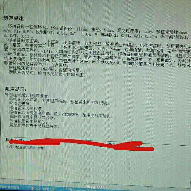 主诉:肾移植术后7月余,血肌酐升高1周。 病史:患者因尿毒症于2015年4月在我院行异体肾移植术,手术过程顺利,术后肌酐降至约240umol/L,服用FK506+MMF+Pred免疫抑制维持治疗,定期随诊。7月因移植肾输尿管瘘在我院泌尿外科行膀胱镜下移植肾输尿管逆行置管术,手术过程顺利,术后恢复良好,9月拔除支架管,定期随诊无特殊,肌酐维持约350umol/L,11/11复查肌酐为382umol/L,昨日复查血肌酐为495umol/L,患者诉尿量稍减少,移植肾轻微疼痛,无诉其他不适。