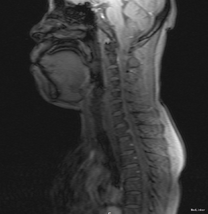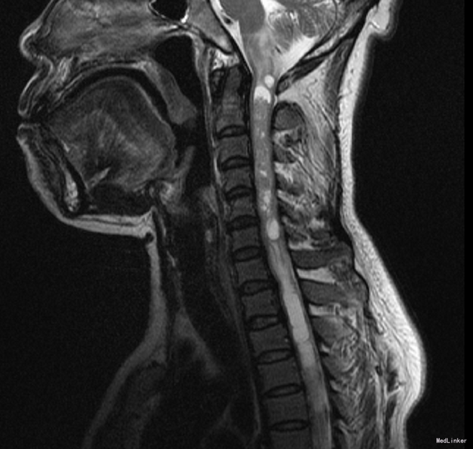 四肢自主活动,肌力V级,双上肢浅感觉减退,深感觉正常,病理征阴性。 本院颈椎MRI示“延髓及约颈1-6椎体水平颈髓髓内肿瘤,室管膜瘤可能性大,胶质瘤(毛星)待排。”