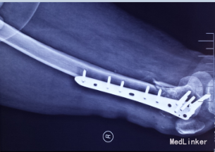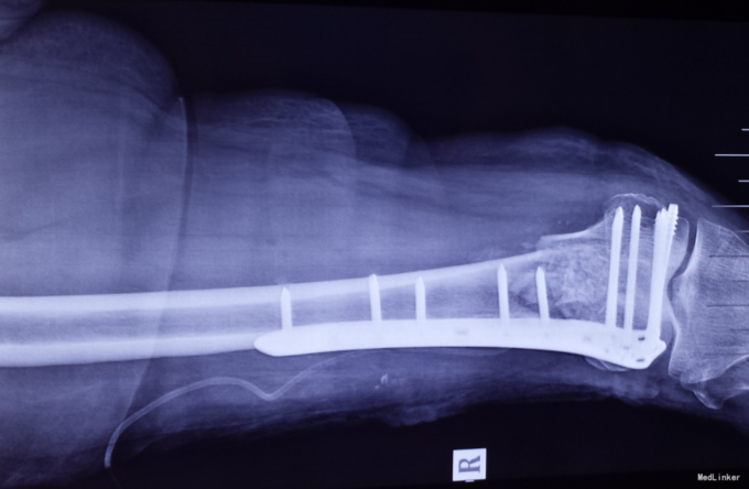 光片诊断患者骨折端粉碎,软组织损伤,发生股骨踝间骨折。采用切开复位,普通钢板、髁部支撑钢板内固定治疗股骨髁间粉碎性骨折。