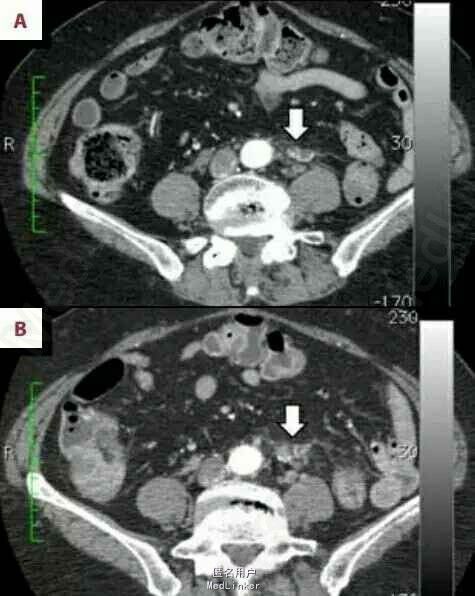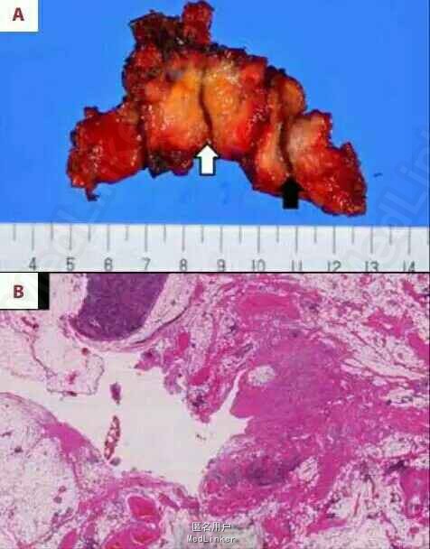 随后患者行手术切除,病变位于左侧输尿管与腹主动脉及分支之间。术后标本肉眼观可见肿块由结缔组织组成,包括白色和坚韧的瘢痕组织。组织学病例结果显示为良性脂肪组织,包括纤维血管成分。