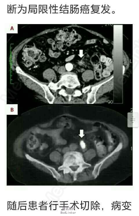 患者为69岁老年男性,5年前因体检发现大便潜血沿线哪个和CEA升高来我院就诊。结肠镜检查发现异常结肠肿物并管腔下载,结肠镜镜头无法通过。活检病理提示高分化下奶。CT检查示无浆膜侵袭和远处转移,临床分期为II期。患者遂行结肠癌根治术,周围淋巴结清扫。术后病理标本显示癌灶已经侵蚀浆膜层,周围淋巴结未见转移征象。后患者定期复查血生化及CT,未见肿瘤复发转移。