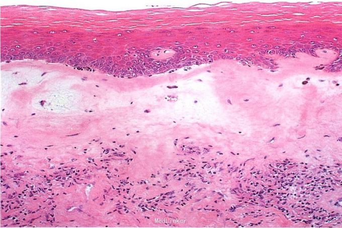 皮肤科检查:双侧大阴唇轻度水肿,略充血,表面轻度苔藓样变,外阴部分皮肤略有萎缩,颜色发白,较周围皮肤发亮。病理活检提示:表皮角化过度,基底细胞灶状液化变性,真皮上部胶原纤维均质化,真皮中部可见以淋巴细胞为主的炎性细胞带状浸润。