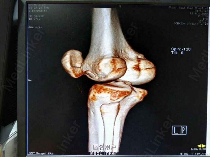 诊断:左髌骨内关节面骨折。 治疗:硬膜外麻醉下行关节镜辅助下复位可吸收螺丝钉内固定手术。
