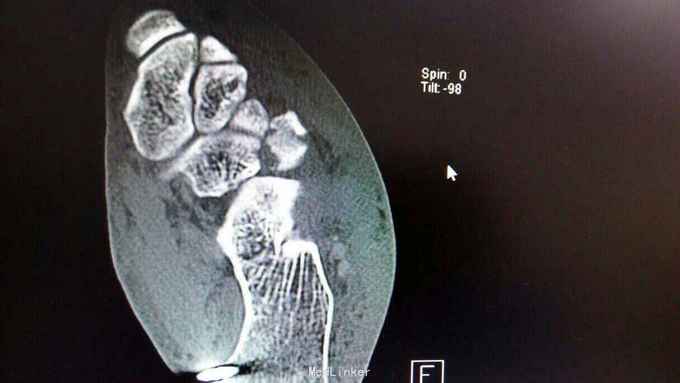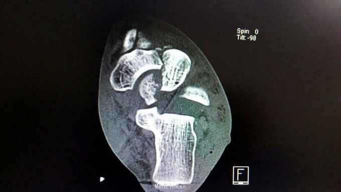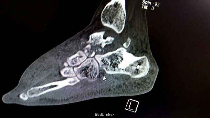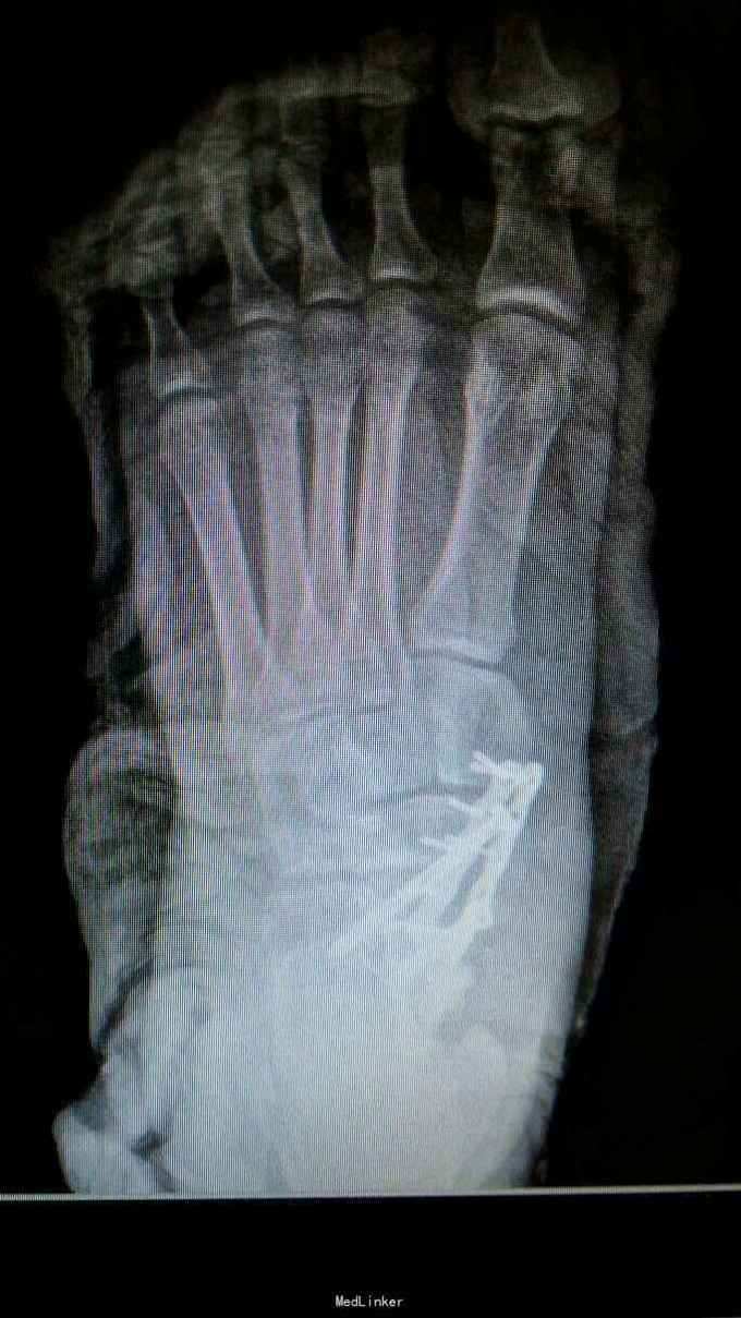 重物砸伤左足疼痛畸形14小时。