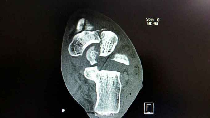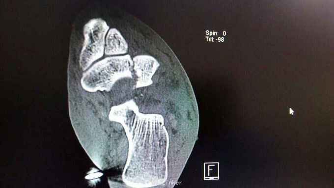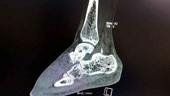 距骨骨折并脱位 入院行闭合手法复位失败,予以跟骨牵引5天,石膏外固定3天,皮肤水泡、肿胀消退后行,距骨骨折脱位切开复位内固定+距舟关节融合。术后支具外固定,勿负重3个月。