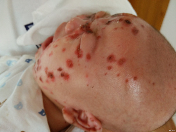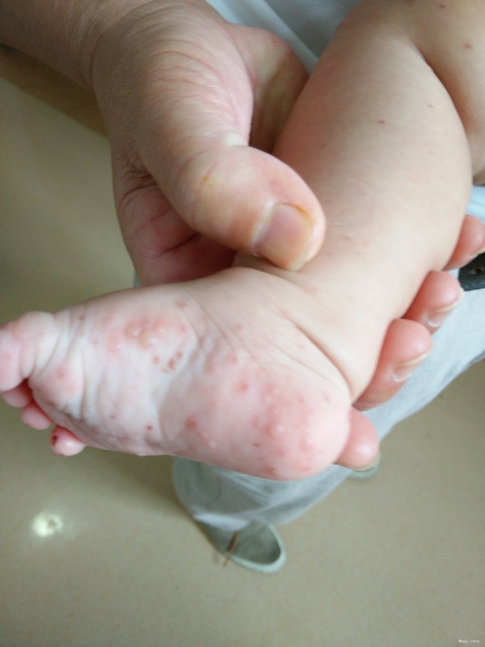 患儿 男8个月 因面部红斑,水疱,结痂2天,伴发热3天就诊。 病史:患儿三天前出现发热,最高达到39度,两天前出现面部散在红斑,丘疹,水疱,破溃结痂,局部有渗出。部分皮疹出现脐凹。患儿有面部婴儿湿疹史。诊断kaposi水痘样疹,给予更昔洛韦针静脉滴注,外用更昔洛韦软膏以及百多邦。两天后患儿臀部,会阴部,下肢,足底,手掌等多发米粒至绿豆大小水疱,水疱边缘有红晕。口腔唇部及咽部见散在水疱。诊断“手足口病”,同前治疗,加用利巴韦林喷雾剂外用。