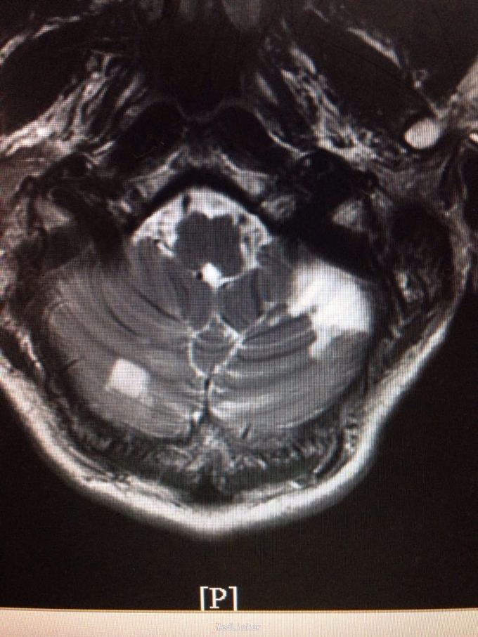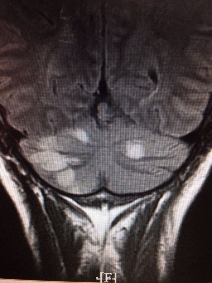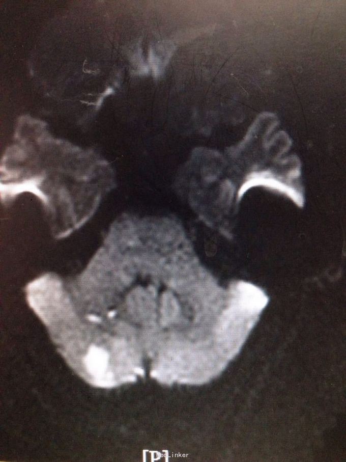 查体:双侧瞳孔等大等圆,直径2mm,双眼左视可见震颤,Romberg征阴性,跟膝胫试验欠稳准,NIHSS评分3分,洼田饮水试验1级。 我院急诊头颅CT示:双侧小脑半球片状低密度影,考虑脑梗塞。 颅脑MRI示:双侧小脑半球多发急性脑梗塞,以右侧为著。