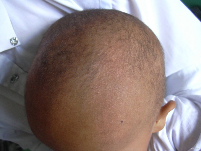 头发稀疏,纤细,无明显卷曲。眉毛、睫毛正常。唇红,口周有粗糙的轻微角化性红斑。 双手、足指(趾)甲营养不良,呈灰白色,无光泽,双手指甲远端呈弧形翘起,部分足趾甲被增生性角化性斑块所覆盖。双手、足可见黑色或黑褐色显著角化性疣状斑块,部分融合,间杂有角化性红斑,境界清楚,掌跖角化性斑块周边有色素沉着和红晕。肛周有角化性红斑,边缘有黑褐色疣状角化性斑块,边界清楚。 病理学检查:(足弓后内侧皮损)表皮显著角化过度,棘层和颗粒层增厚,真皮浅层有少量慢性炎性细胞浸润,为非特异性改变。头发光学显微镜下检查无明显形态学异常。染色体核型分析未发现异常。
